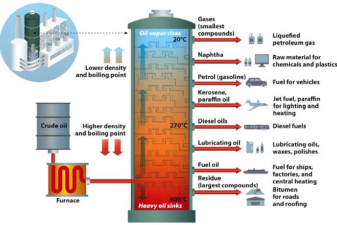 Subsequent fractions yield diesel fuel, kerosene, jet fuel, and gasoline.
