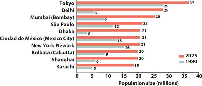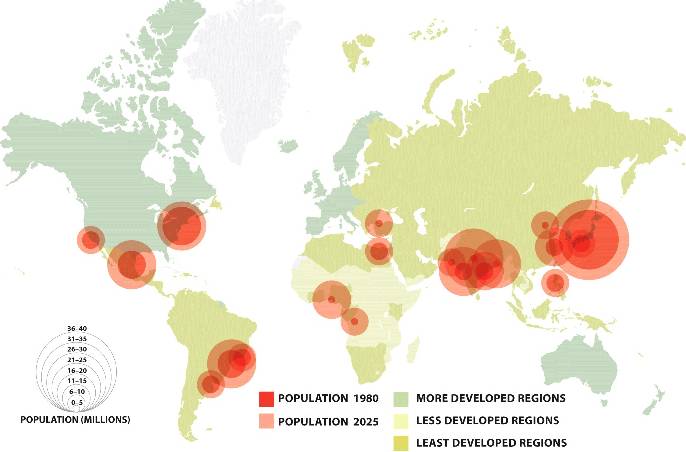 Many of the large cities will surpass 20 million by 2025; most of the world's megacities will be found in Asia.