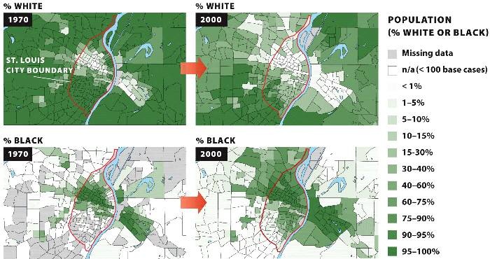Often this leaves a low-income inner city with heavy minority populations surrounded by wealthier suburbs of white populations.